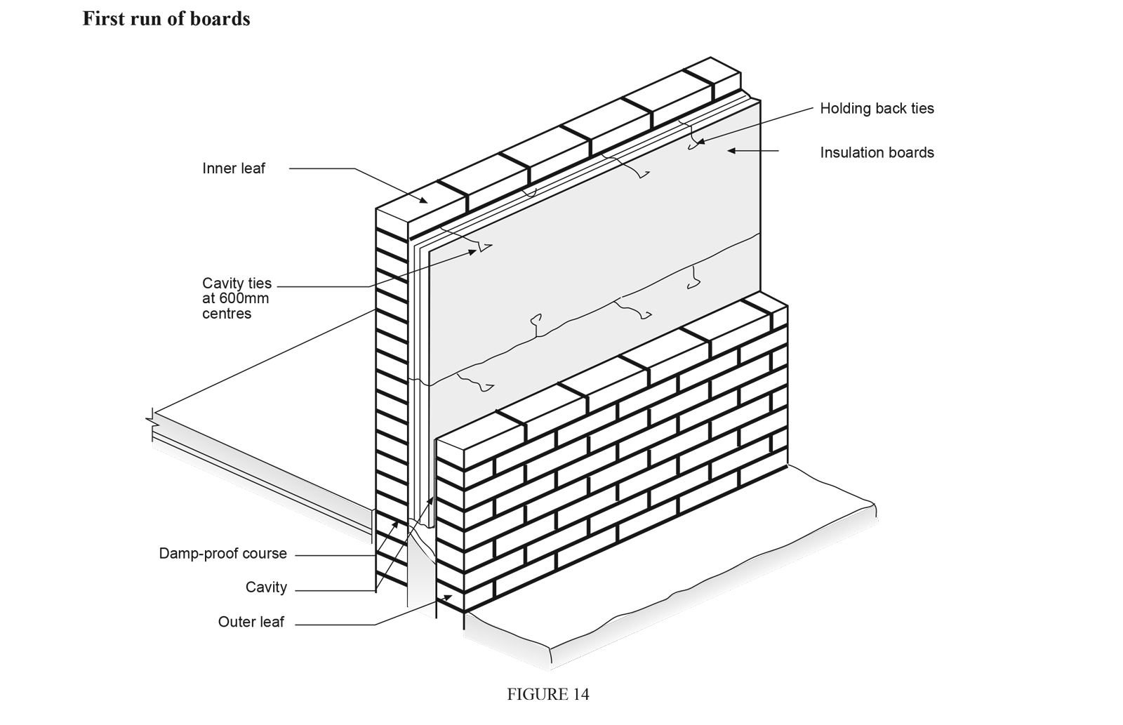a) The walls are constructed leading with either the inner or outer tier. If a residual cavity is specified, the inner tier must then be constructed ahead of the outer tier and the insulation fixed to the cavity face of the inner tier. Fixing EPS boards in this manner enhances the thermal performance.